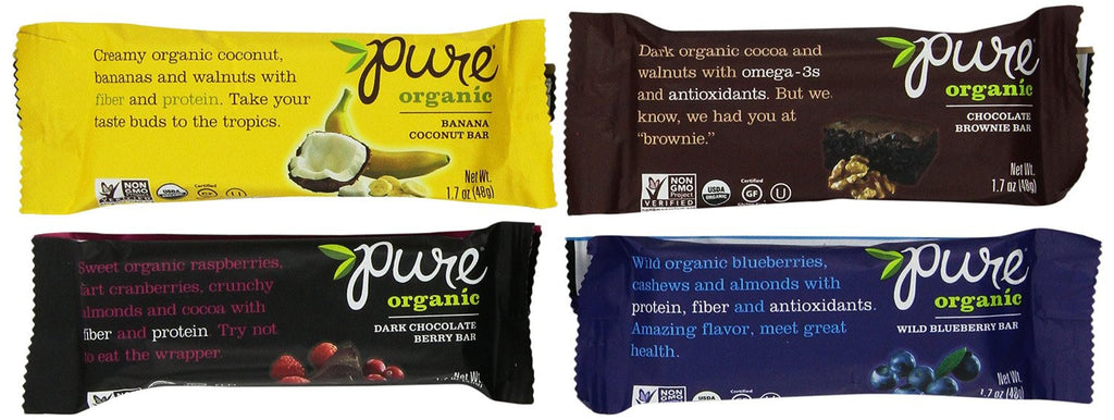 Pure Organic variety Pack contains 12 of our top-selling fruit & nut bars; 3 each of Chocolate Brownie, Wild Blueberry, Banana Coconut and Dark Chocolate Berry